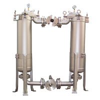 雙聯切換式過濾器,采用兩三個通球閥,將兩個單筒過濾器組裝在一個機座上,清洗過濾器時不必停車,保證其連續工作。